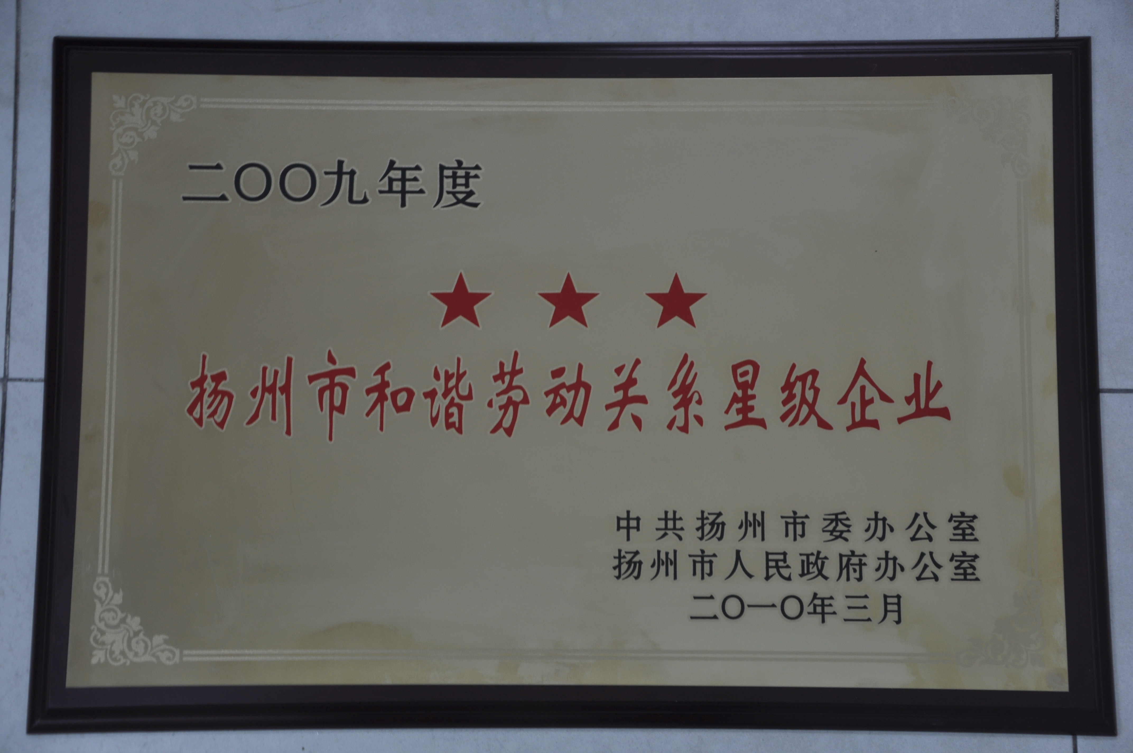 集團(tuán)公司獲2009年揚(yáng)州市和諧勞動關(guān)系“三星級企業(yè)”殊榮