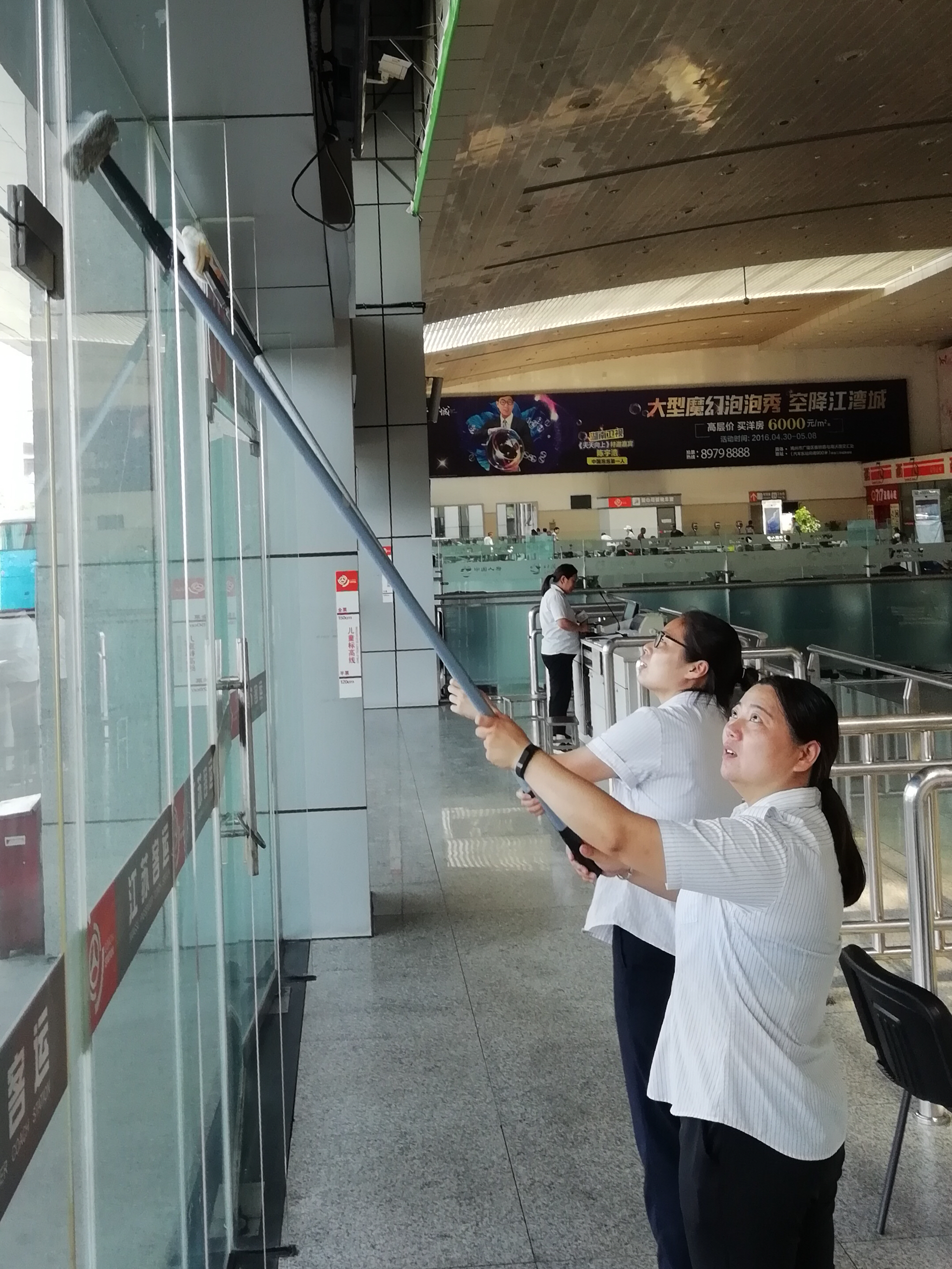 我市愛國(guó)衛(wèi)生委員會(huì)向全市發(fā)出創(chuàng)建衛(wèi)生城的號(hào)召,東站干群立即行動(dòng)起來(lái),成立以徐建波為組長(zhǎng)的創(chuàng)建衛(wèi)生城領(lǐng)導(dǎo)小組,宣傳組、后勤組、督查組分工明確,專人負(fù)責(zé),對(duì)全站重點(diǎn)部位展開拉網(wǎng)式檢查,綠化、門窗、地面、燈光、水電、副業(yè)網(wǎng)店、宣傳氛圍等方面嚴(yán)格按照市愛國(guó)衛(wèi)生委員會(huì)文件要求逐一排查,整改到位。下客區(qū)、停車場(chǎng)、閘口地面年久失修,影響旅客和車輛出行,交投和集團(tuán)分管領(lǐng)導(dǎo)親臨一線,安排施工隊(duì)進(jìn)場(chǎng)作業(yè),加班加點(diǎn),現(xiàn)在地面已經(jīng)面目一新。綠化帶苗木缺失,研究方案,已補(bǔ)苗改造到位,玻璃長(zhǎng)廊鐵框銹跡斑斑,立即安排工人冒高溫到現(xiàn)場(chǎng)油漆作業(yè)奮戰(zhàn)兩天,現(xiàn)在已經(jīng)煥然一新。東站各部門、班組排了衛(wèi)生值班表,每天對(duì)照創(chuàng)建衛(wèi)生城的標(biāo)準(zhǔn),對(duì)工作場(chǎng)所包干區(qū)的衛(wèi)生進(jìn)行認(rèn)真打掃清理。