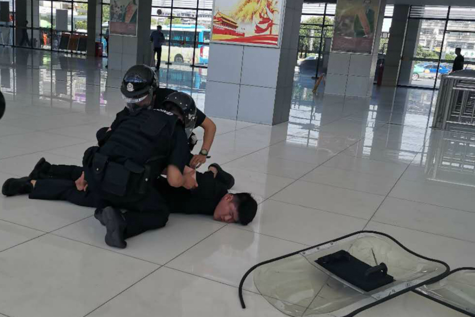 本次演練主要針對(duì)人員密集場(chǎng)所犯罪分子持刀砍殺旅客的警情進(jìn)行模擬。一名“黑衣男子”因生活受挫報(bào)復(fù)社會(huì),在江都客運(yùn)站售票大廳內(nèi)持刀砍殺旅客。車站工作人員立即疏散旅客,利用110聯(lián)動(dòng)中心緊急聯(lián)系警方。當(dāng)接到報(bào)警后,110指揮中心立即發(fā)出指令,要求江都區(qū)特警大隊(duì)、刑警大隊(duì)、交警大隊(duì)以及新區(qū)派出所人員攜帶裝備迅速趕到客運(yùn)站展開抓捕工作。警方將“嫌疑人”有效隔離后,迅速利用盾牌、鋼叉、抓捕器等防護(hù)武器將其制服。