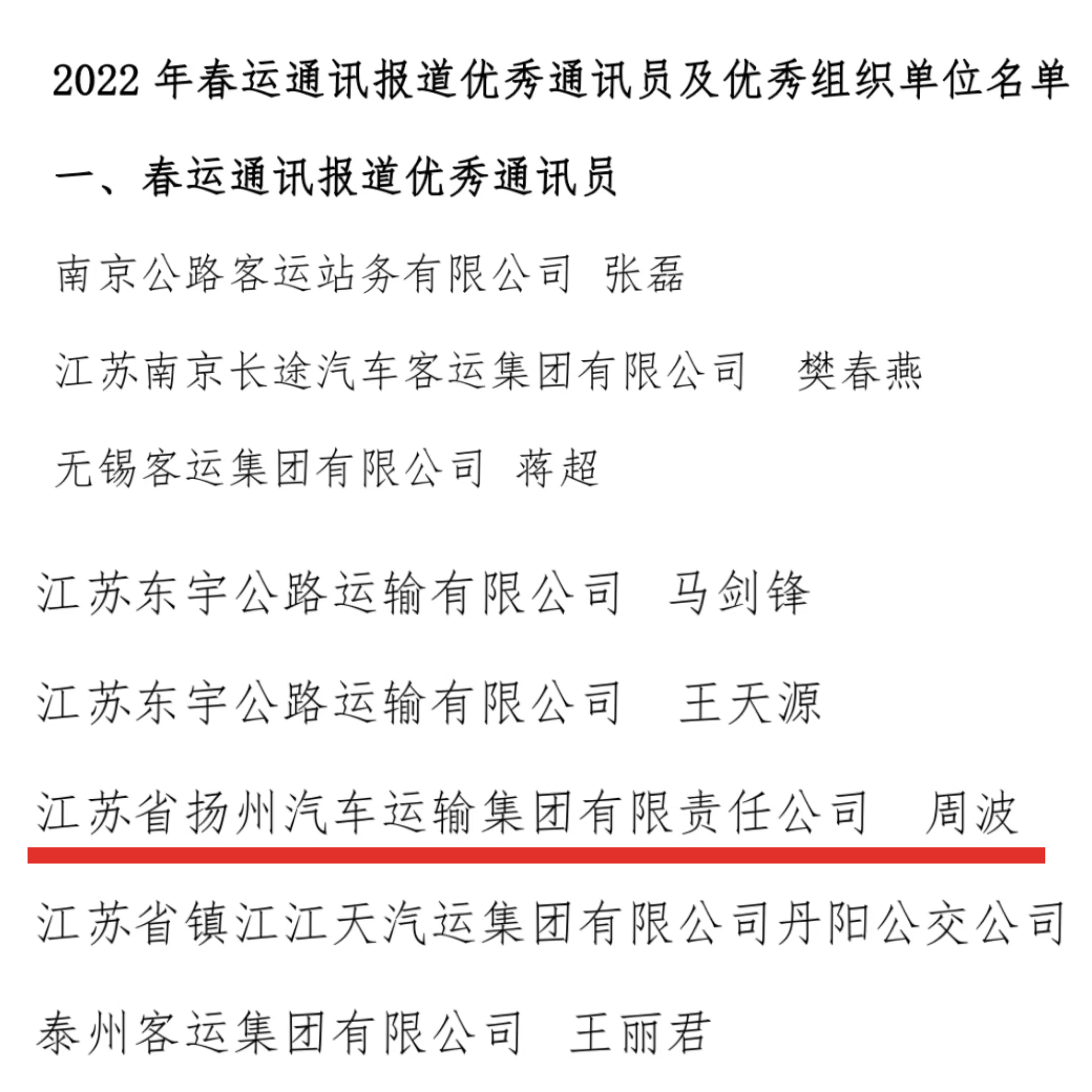 近日,江蘇省交通物流協(xié)會汽車運(yùn)輸分會下發(fā)《關(guān)于表彰 2022、2023 年春運(yùn)報(bào)道“優(yōu)秀通訊員”、“優(yōu)秀組織獎(jiǎng)”的決定》,集團(tuán)周波獲評“2022 年、2023年春運(yùn)通訊報(bào)道優(yōu)秀通訊員”,陳思宇獲評“2023 年春運(yùn)通訊報(bào)道優(yōu)秀通訊員”。